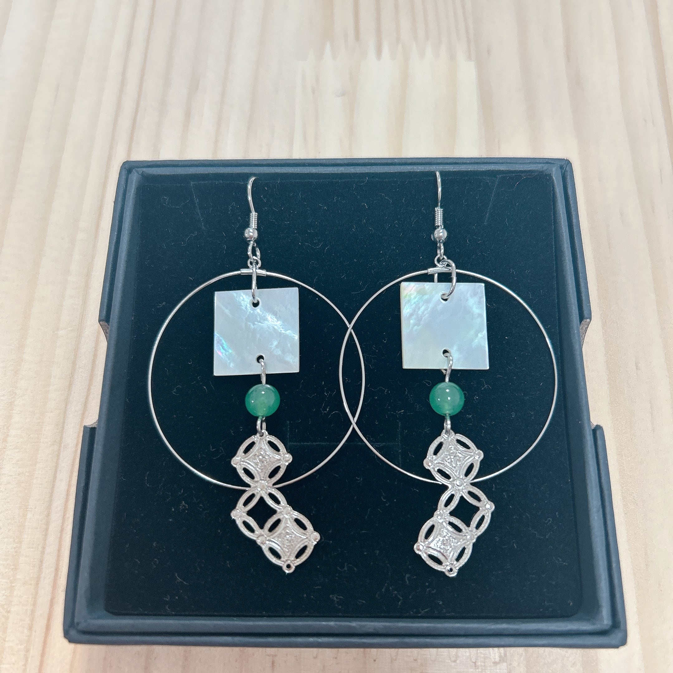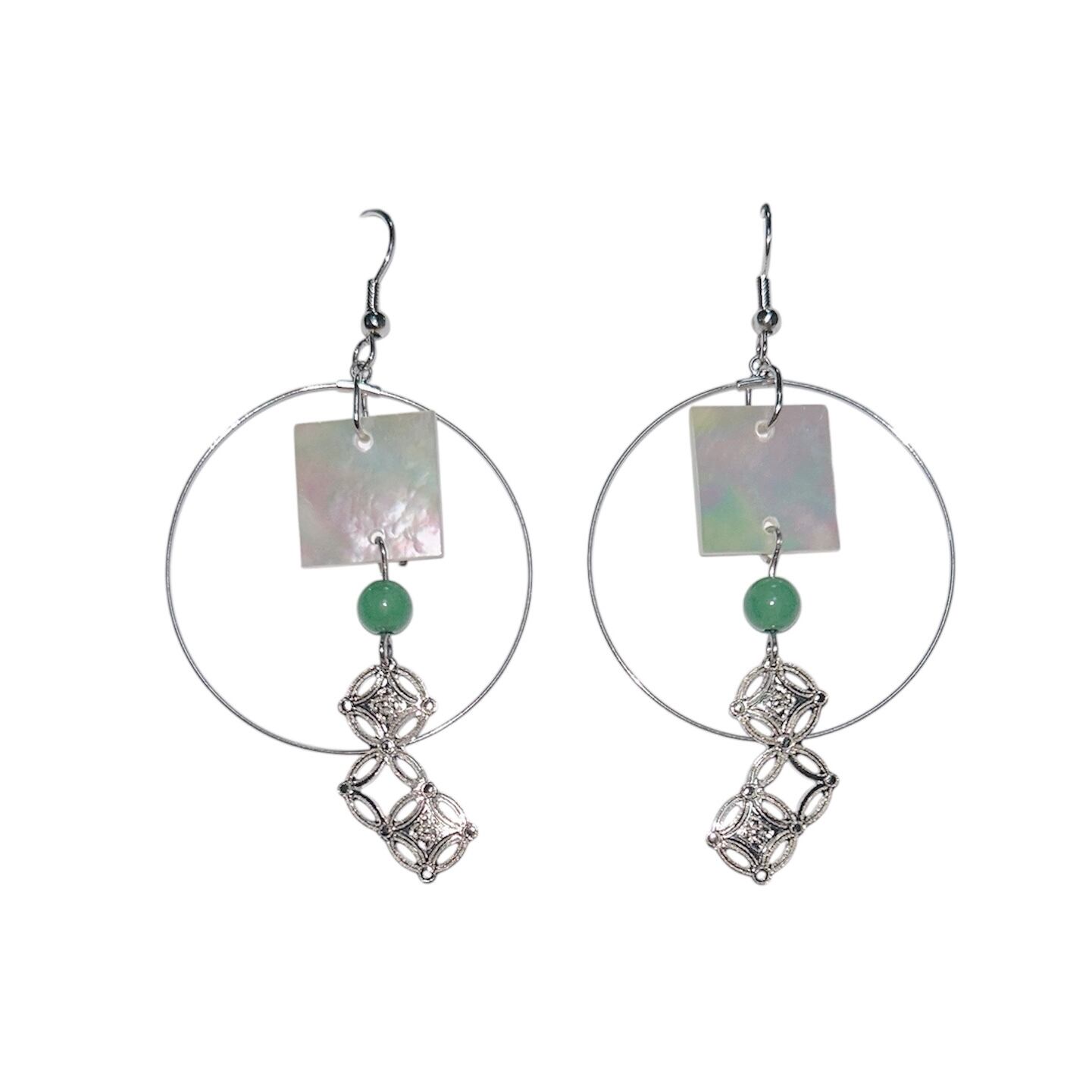 洗練された美しさと迫力を兼ね備えた、特別な七宝柄×スクエアシェルのピアスが誕生しました!職人が丹精込めて制作した真鍮の七宝柄と、4cmの存在感ある大き目フープ、そして正方形のシェルと緑の天然石が組み合わさり、耳元で華やかに煌めきます。