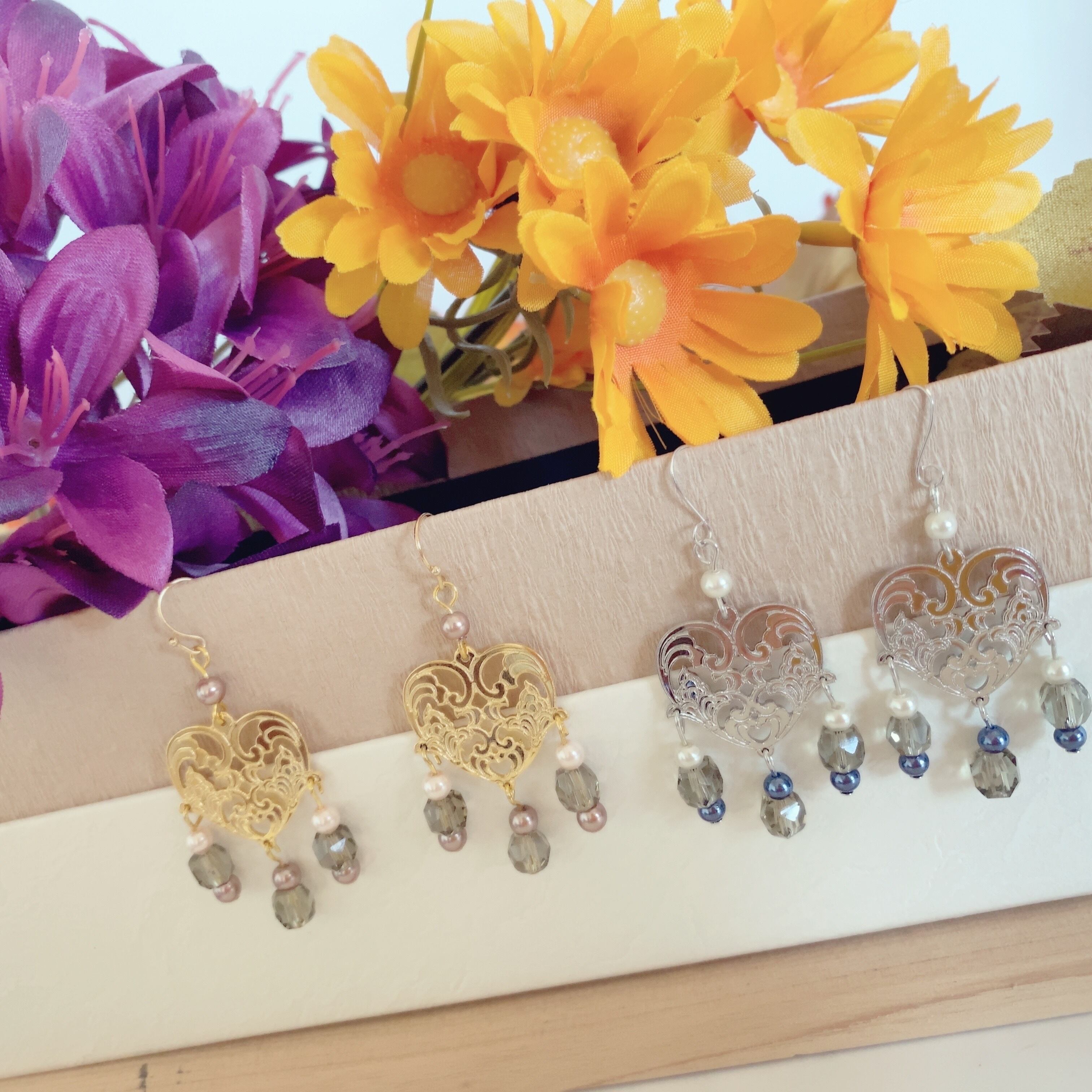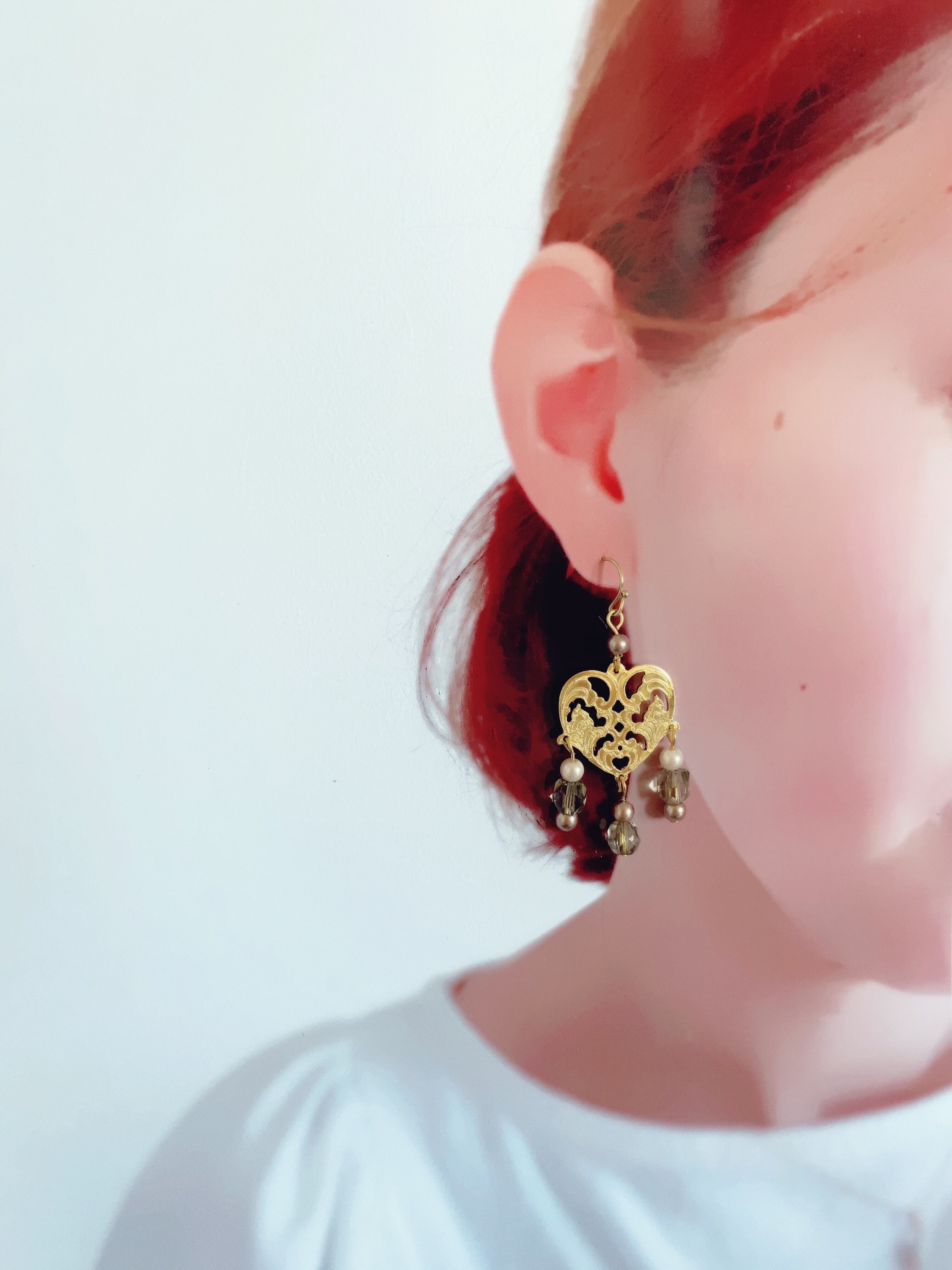 60年代のデッドストックのガラス、アンティークビーズを贅沢に使用し、尾張仏具の伝統工芸師が提案するパーツと組み合わせたピアス。