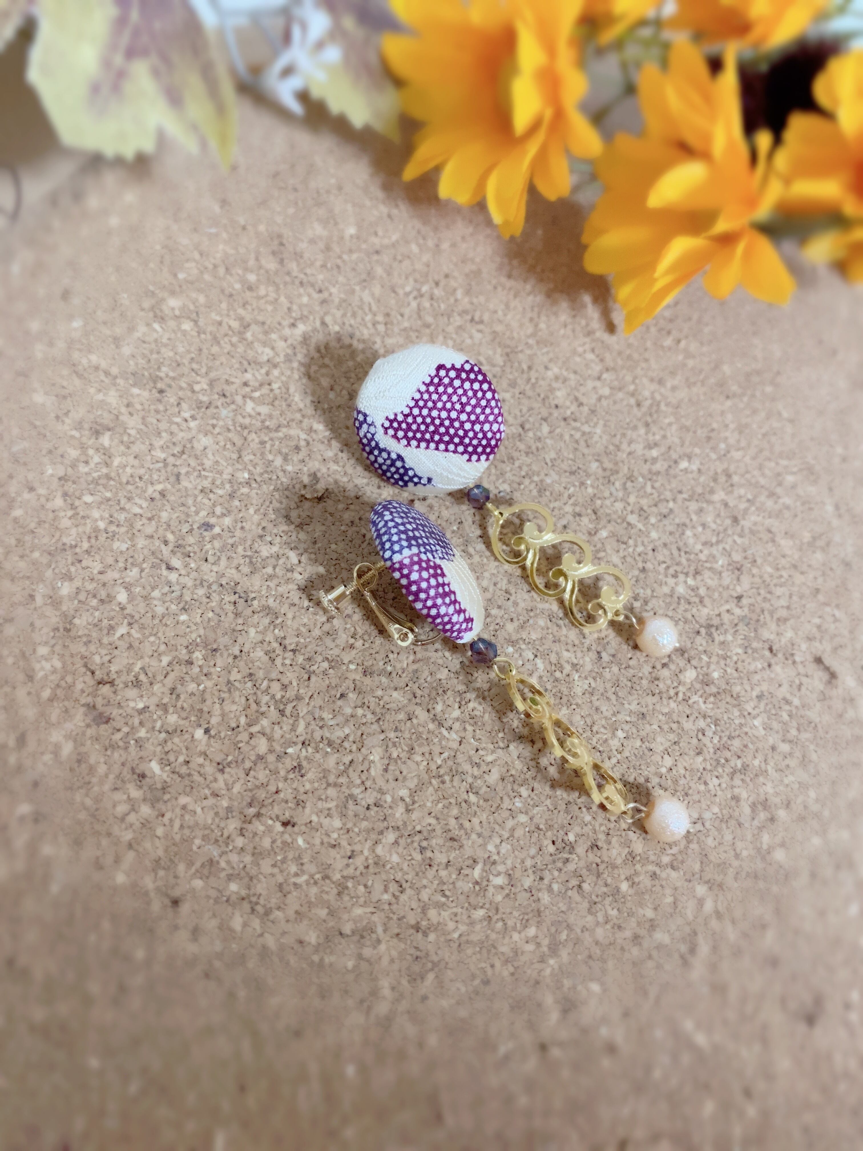 正絹の着物地は上品な光沢、その下に小さなパープルのカッティングビーズ+猪目模様のパーツとシャンパンピンクのパールビーズを組み合わせてあります。